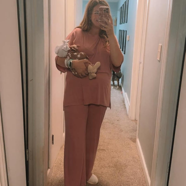"I was 29 weeks pregnant when I bought this set and sized up one for comfort. It has been my go-to for doctor visits, errands, and just lounging at home. The waistband stretches beautifully, and I continue to use it postpartum too"