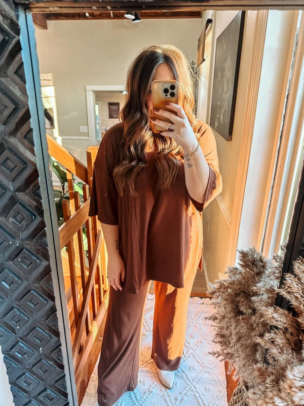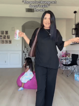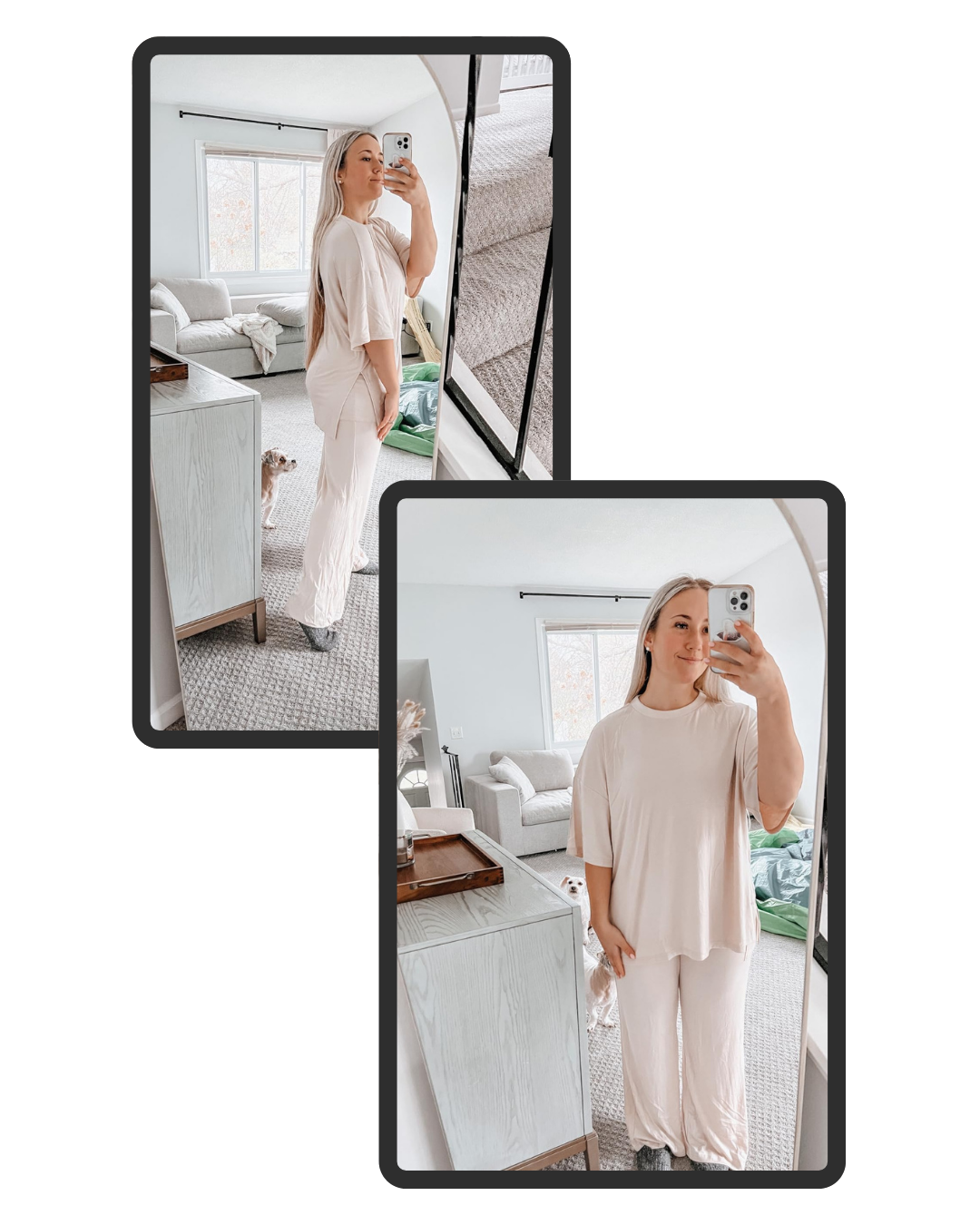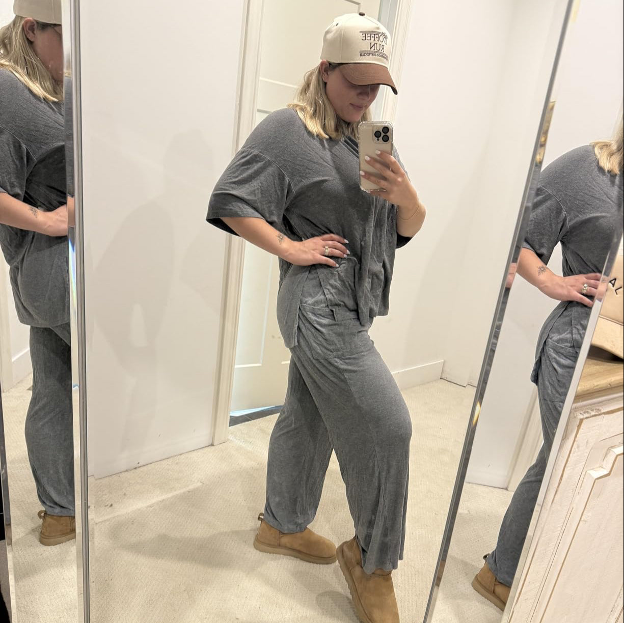 "I LOVE this lounge set!! The wide-leg pants are roomy without looking sloppy, and the top drapes beautifully. I’m 5’3” (long torso, short legs) and the pant length is perfect. Ordered a medium. Always hard to find sets that don’t have crazy long pants!"
