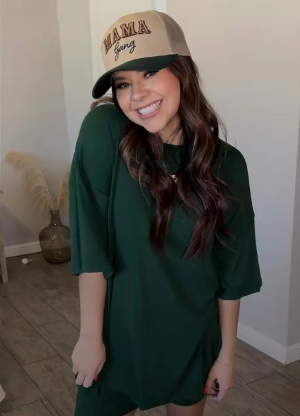 Absolutely. The high-stretch shorts and oversized shirt are perfect for bumps and beyond. It’s a favorite among expecting mamas.